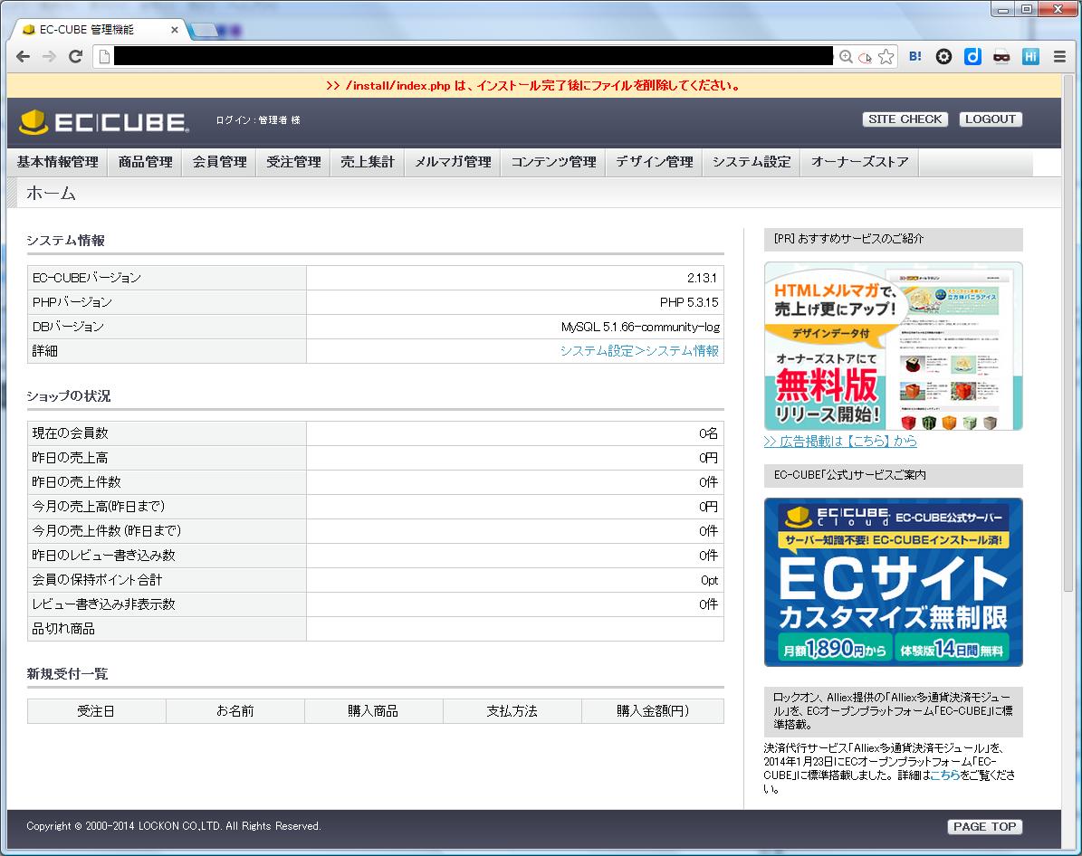 ログインが出来ればインストールは成功なので『install』フォルダは削除する
